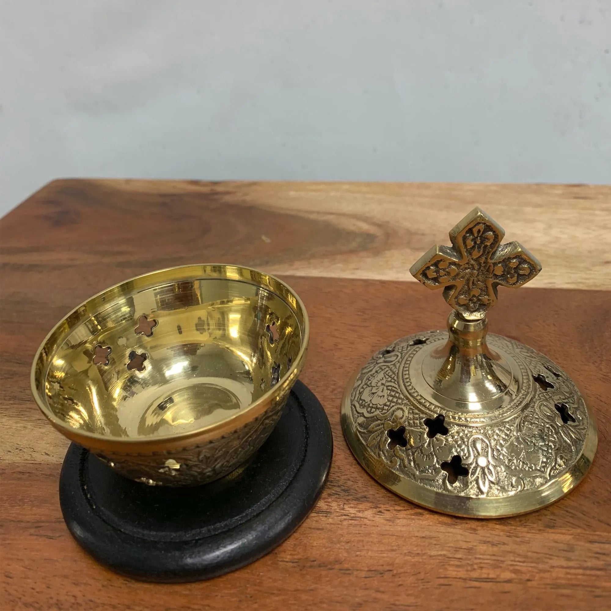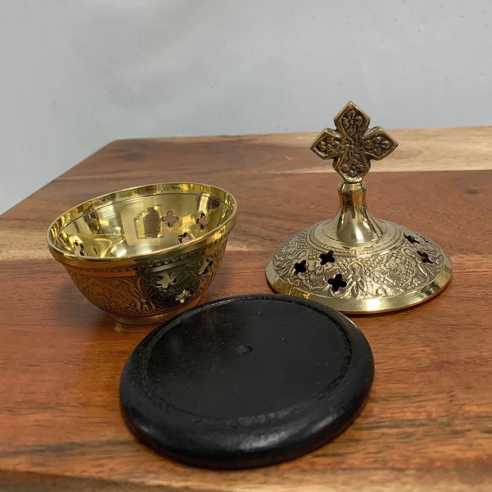 Brass Resin Incense Engraved with Cross Design Greek Orthodox 4" Cone Burner with Wood Coaster