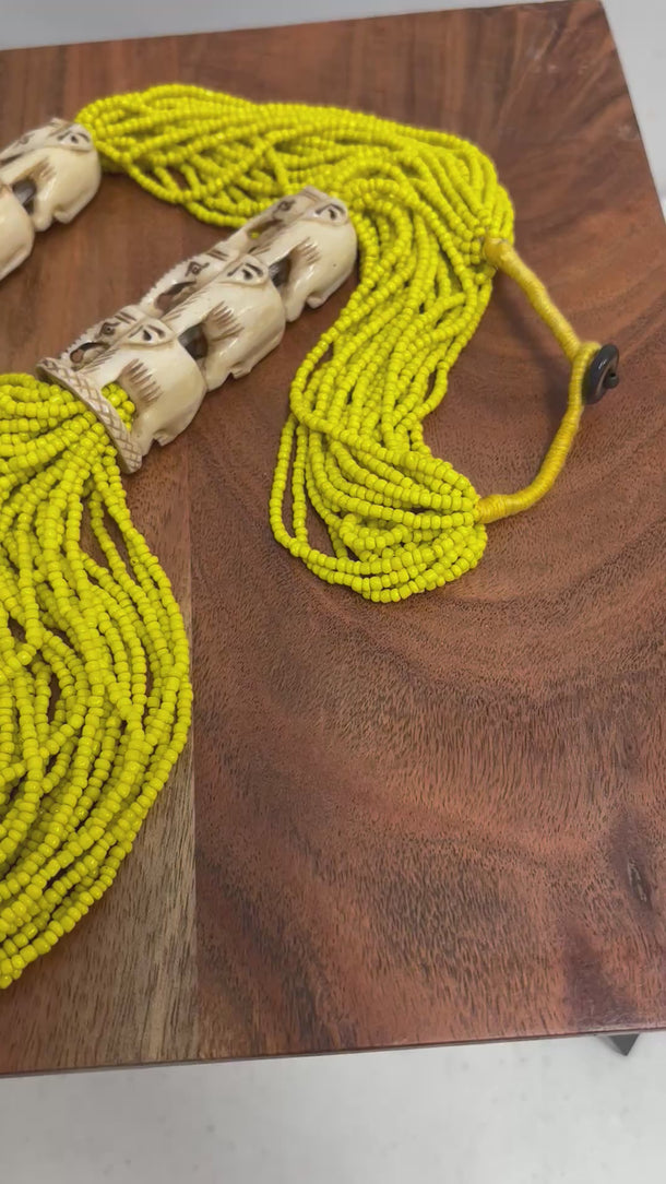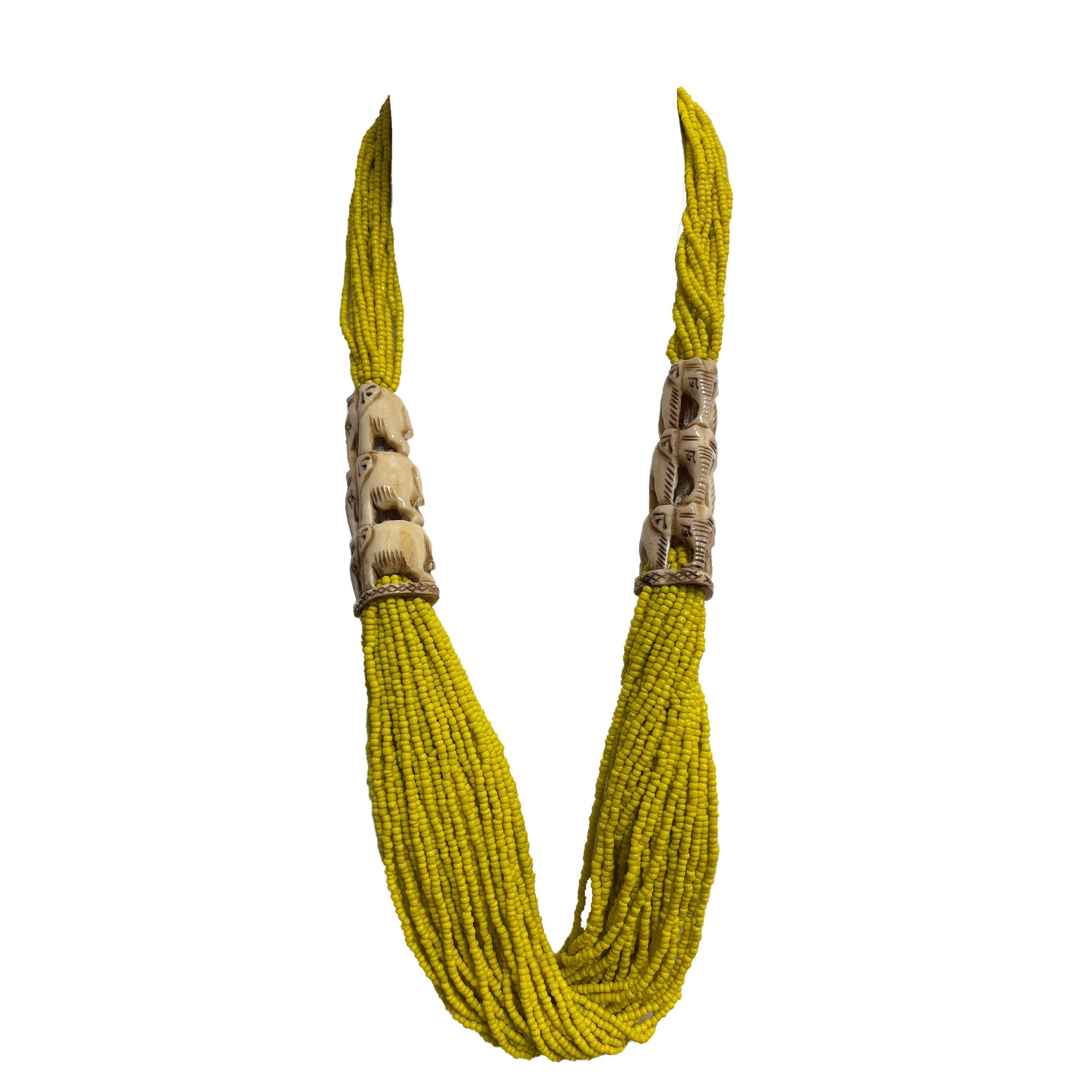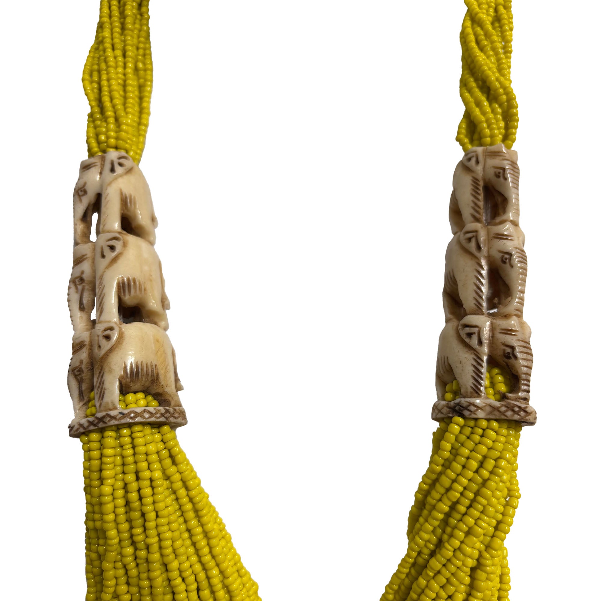 Bring home a piece of traditional Indian craftsmanship with this Handmade Tribal Vintage Multi-Strand Necklace, featuring beautifully carved elephant beads made from natural bone. Each elephant bead is intricately carved by skilled artisans and strung onto multiple strands of fine yellow seed beads, creating a stunning contrast and an elegant, earthy finish.