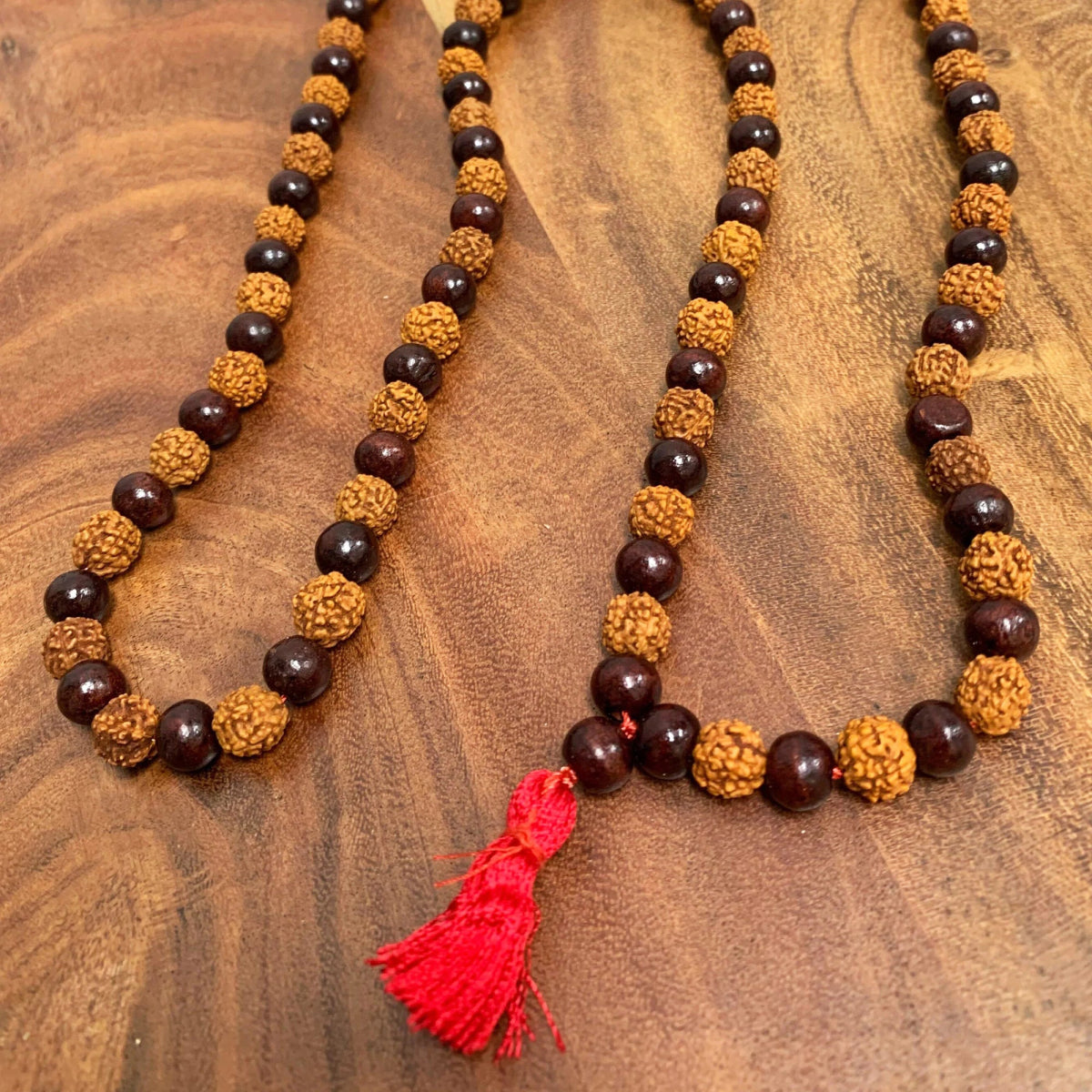 🌸 Material: High-quality Rudraksha seeds and red sandalwood beads