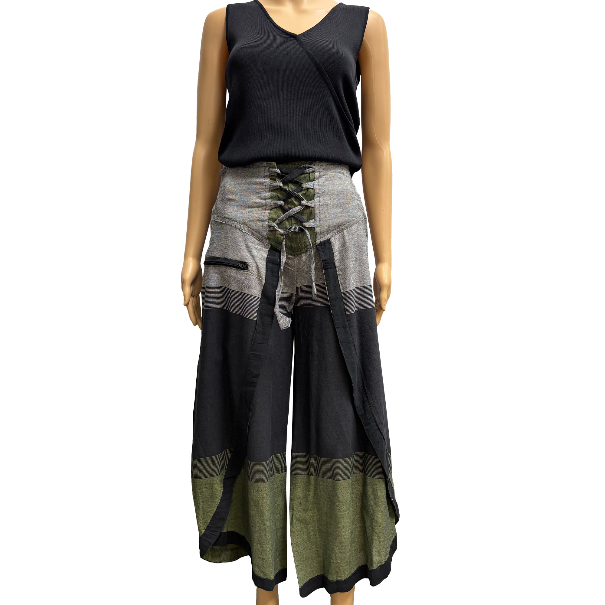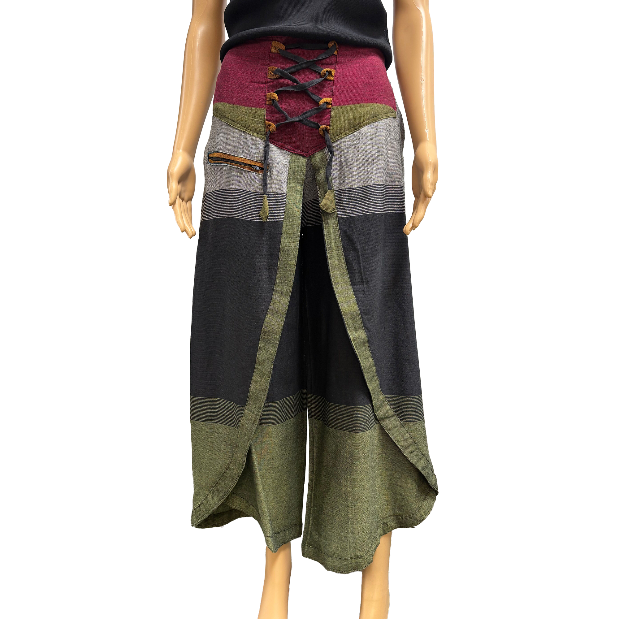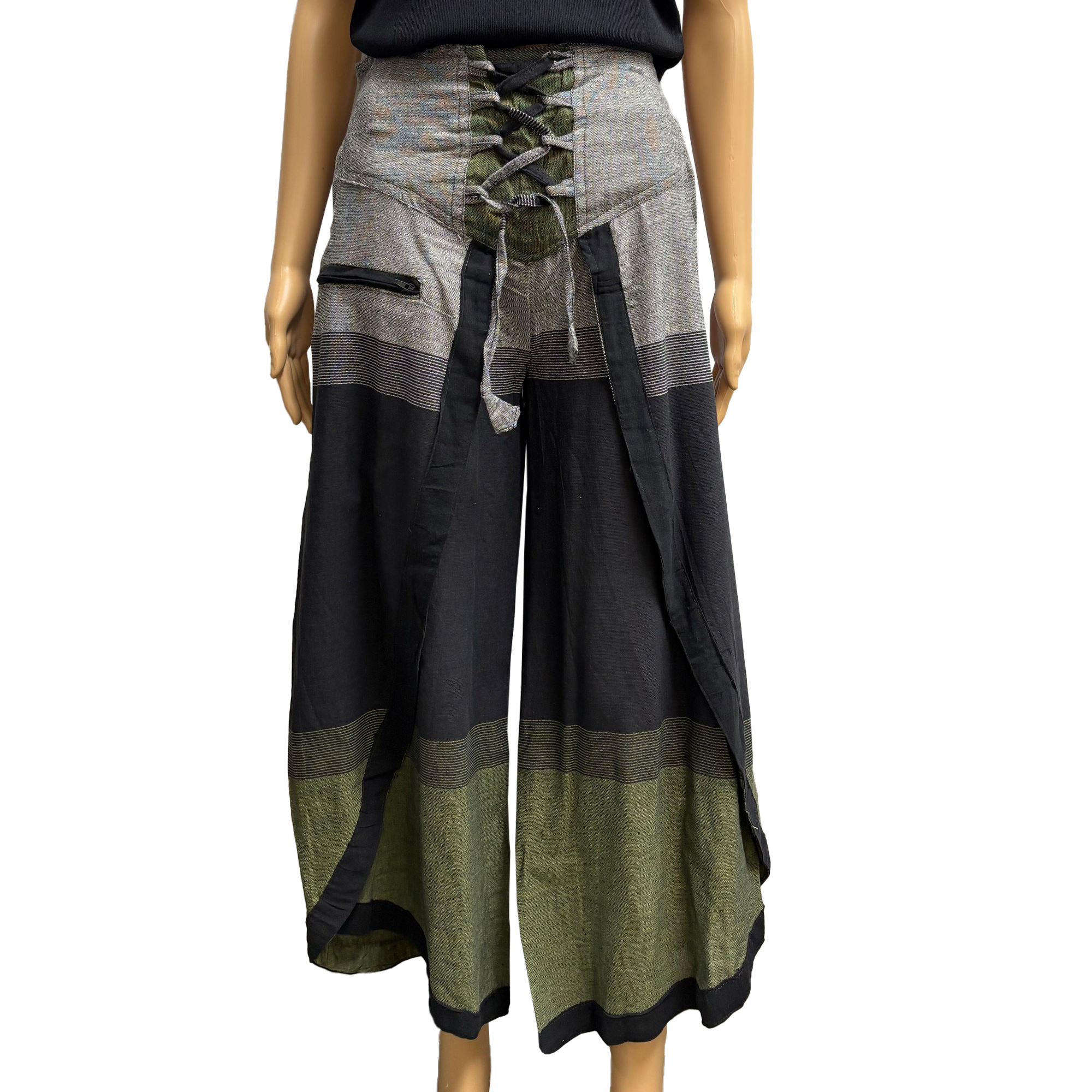 Designed with comfort in mind, these pants include an elastic waistband in the back and adjustable lace-up ties in the front, ensuring a flexible fit. A front zippered pocket adds practicality, making these pants as functional as they are stylish.