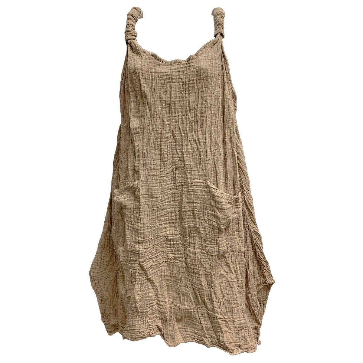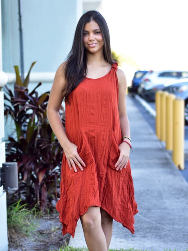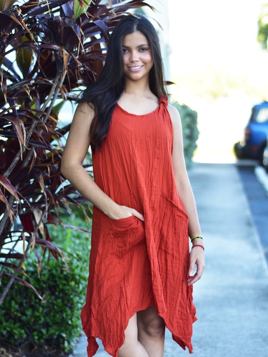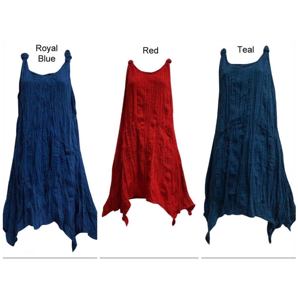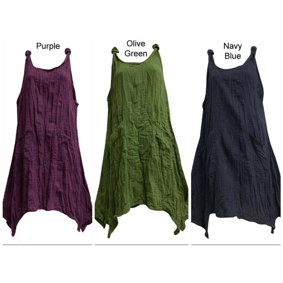 Features two convenient pockets, two side slits, uneven hem. Sleeveless cami-style casual dress